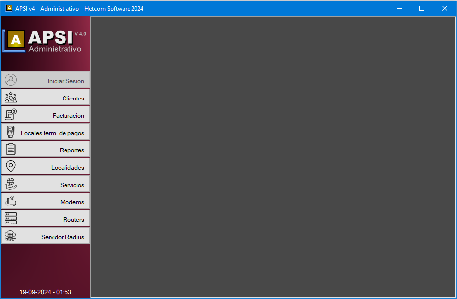 Permite la administración de todos los datos del servidor como, Clientes, Facturación, Servicios de Internet, Servicios Extras, Caja, Servidores Router, Reclamos y Reportes, y todo lo necesario en cada ítems.