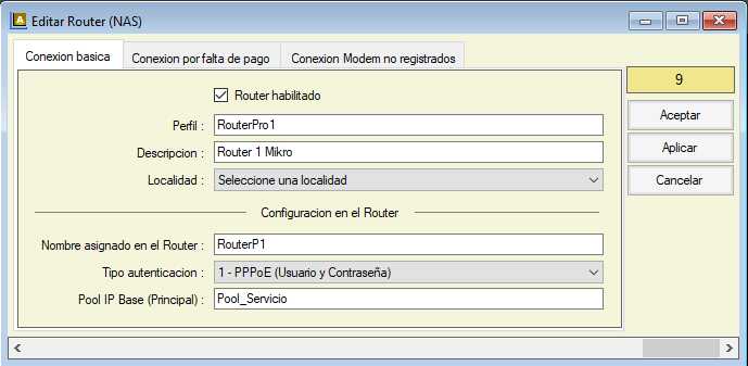 - «Pool IP base» Definir el pool de IP que se utiliza en el router el cual APSIRadius le asigna a una nueva conexión.