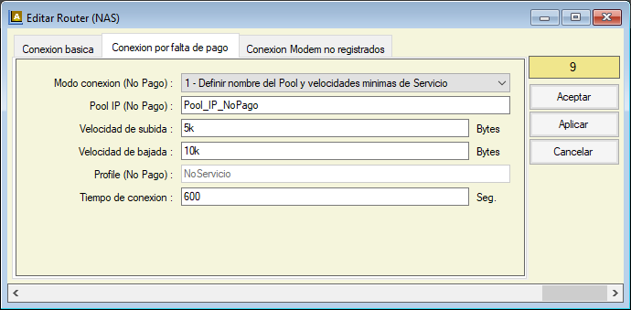 En esta pestaña puede definir ciertas características especiales para las conexiones suspendidas por falta de pago, en algunos casos se interrumpe completamente el servicio, pero también puede asignarle una velocidad mínima con bloqueos a determinados servicios, esta opción le permite definir su propio criterio para estos casos.