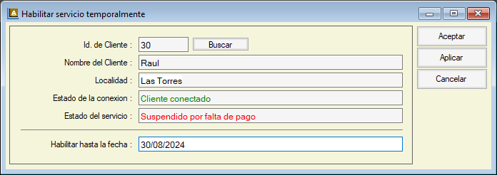 Para el caso de servicios suspendidos por falta de pago, ademas de las opciones del servicio asignado o la interrupción definitiva, podrá optar por la opción de habilitar el servicio temporalmente sin necesidad de habilitaciones complejas, y llevar un registro de dichas habilitaciones para saber si es un cliente recurrente.