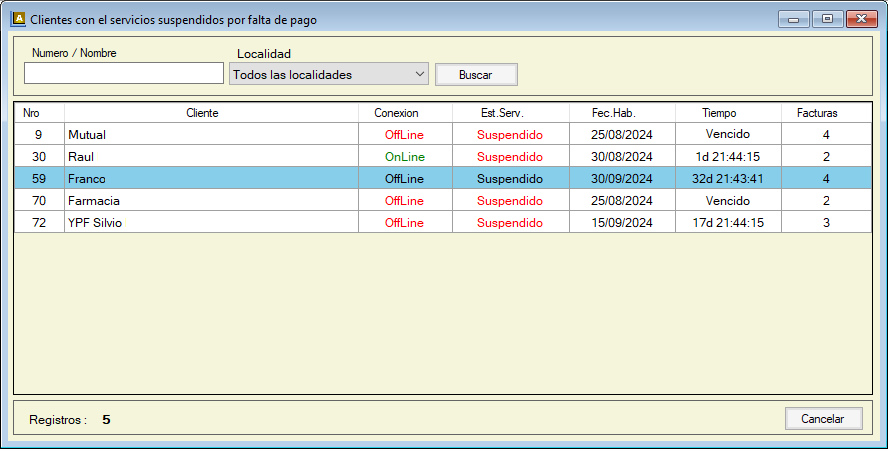 Con un listado de los clientes con el servicio suspendido, se puede observar si ya se le asigno una fecha de habilitación temporal y el tiempo que le resta de conexión, y las facturas adeudadas.