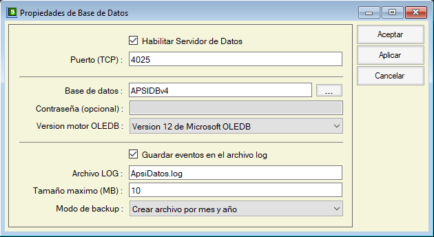 Aquí puede modificar la configuración del servidor de datos, pero por defecto no es necesario realizar ajustes.