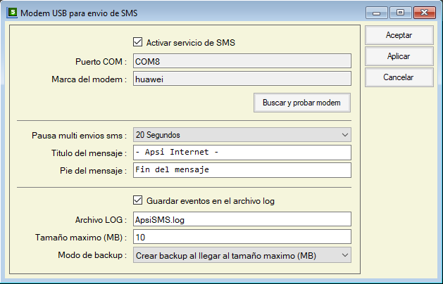 Puede conectar un modem USB con un chip movil para utilizar como envíos de mensajes de textos «SMS» para distintos informes como el de nuevas facturas a cada cliente.