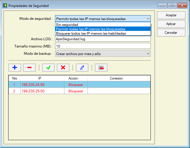 El sistema de seguridad de Apsi es simple pero muy efectivo, y básicamente bloquea o habilita las IP de conexión al Servidor Apsi.